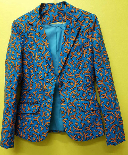 Sophisticated tailored blazer in African Print cotton twill. Chest pocket, welt front pockets with flap, and decorative buttons at cuffs. Vent at back. Lined.